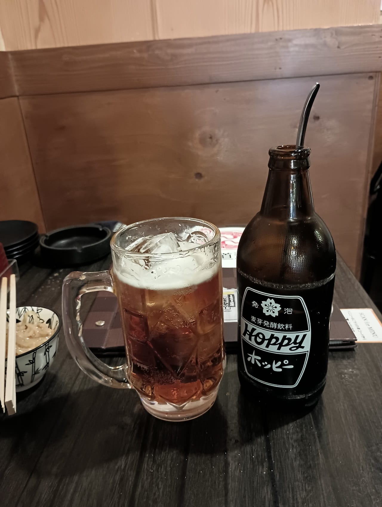 As far as ordering Hoppy or refills, the big words to remember are 'naka' and 'soto'. The shochu is referred to as 'naka', meaning 'inside', and the Hoppy is called 'soto', meaning outside. When you get your first glass they will bring a glass or mug out with the naka already inside and you add the soto to your preference. When adding the soto to the naka be sure to pour it in quickly so it foams up. After you drink what you have and want some more you can order more shochu, "Sumimasen!! Naka!!", or Hoppy, "Sumimasen!! Soto!!". Trust me, it takes a while to get used to shouting for service in an izakaya but a couple rounds of naka and soto will help. I personally usually do two naka per soto, so basically two rounds of shochu to one bottle of Hoppy.